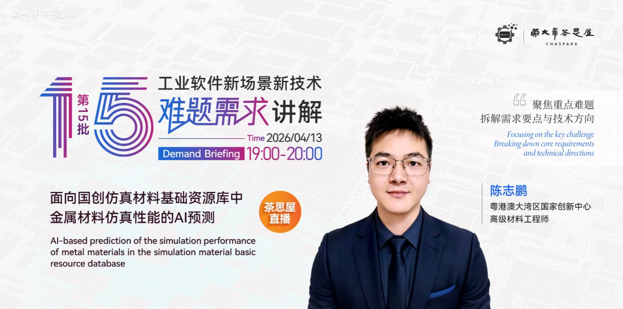 活动信息 主题:工业软件新场景新技术难题需求讲解:面向国创仿真材料基础资源库中金属材料仿真性能的AI预测——陈志鹏(粤港澳大湾区国家创新中心 高级材料工程师)时间:2026-04-13 19:00:00 — 2026-04-13 20:30:00(UTC+08:00) 主讲人:陈志鹏(粤港澳大湾区国家创新中心工业基础资源库高级材料工程师) 直播链接:https://www.chaspark.com/#/live/1260390272153894912