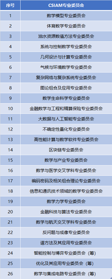 随着应用数学研究领域不断向纵深发展、学科体系日趋精细,中国工业与应用数学学会(CSIAM)专业委员会队伍也持续发展壮大。目前,学会已设有23个专业委员会及3个筹备专业委员会。