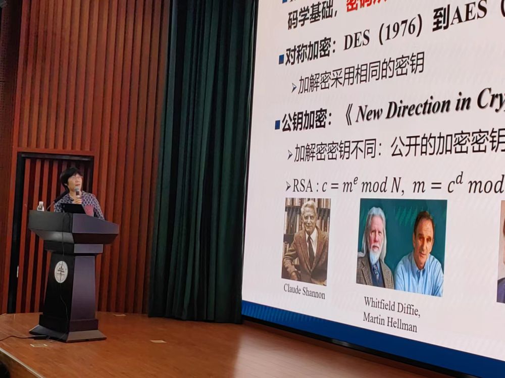 开班仪式结束后,中国科学院院士、网络空间安全学院院长、专委会顾问委员王小云应邀作了题为“高维格理论与格密码前沿研究”的学术报告,报告围绕格密码研究背景、格密码数学问题及其应用展开,指出过去十年,格密码算法性能显著提升,可以支持多数应用场景,分享了团队在格密码方向取得的多项国际领先成果。参会师生与王小云院士就格密码前沿问题展开交流讨论。
